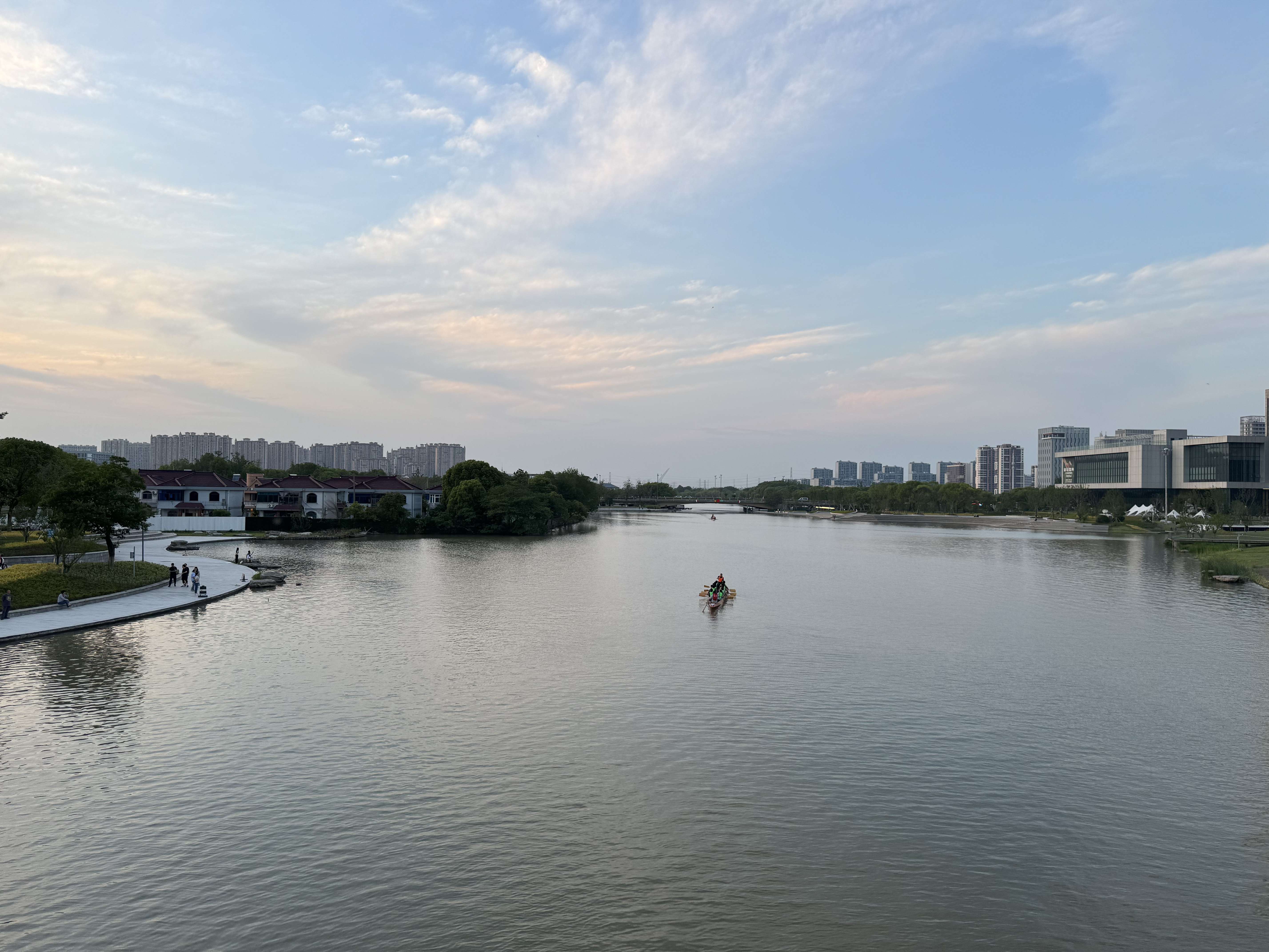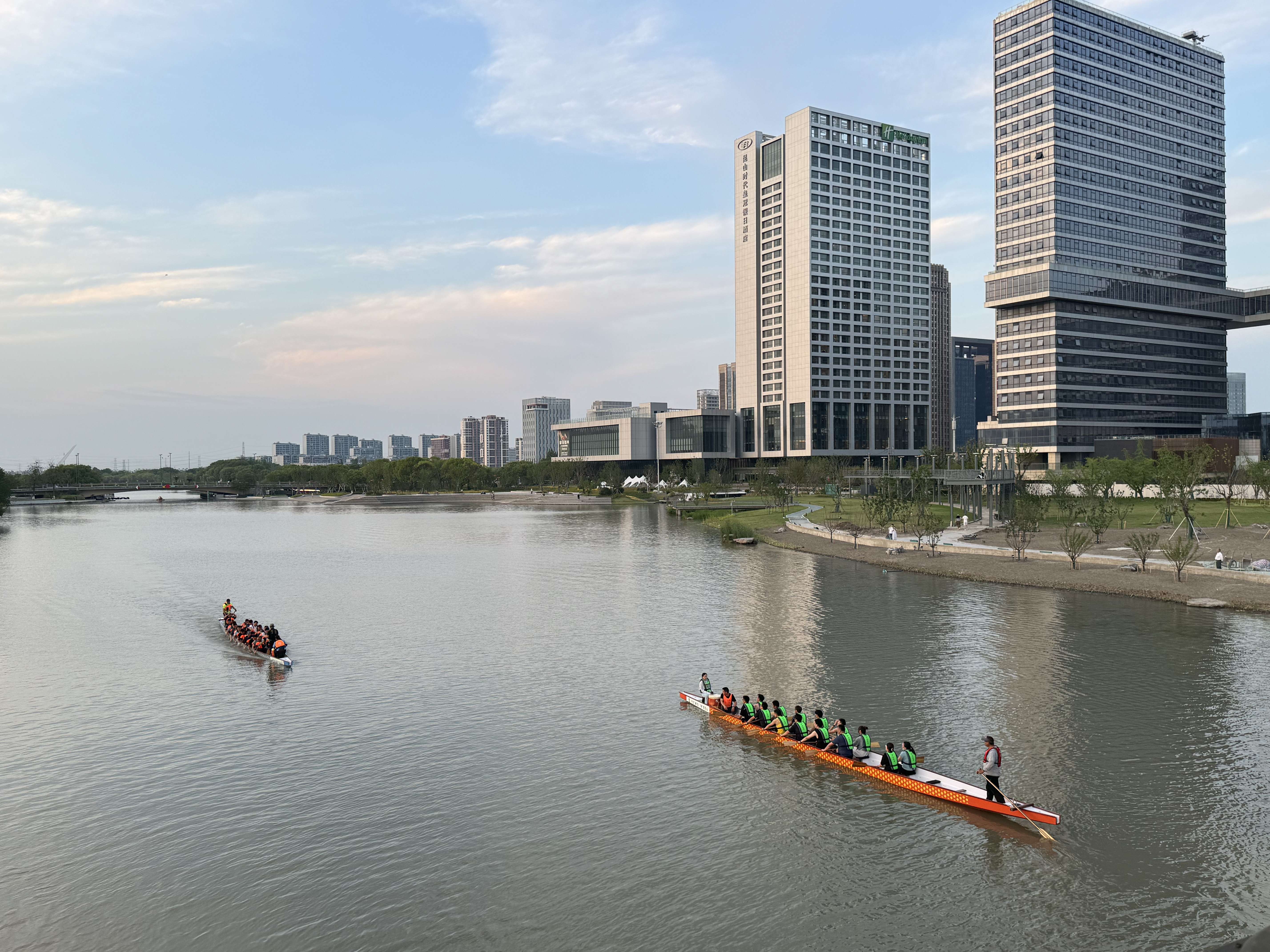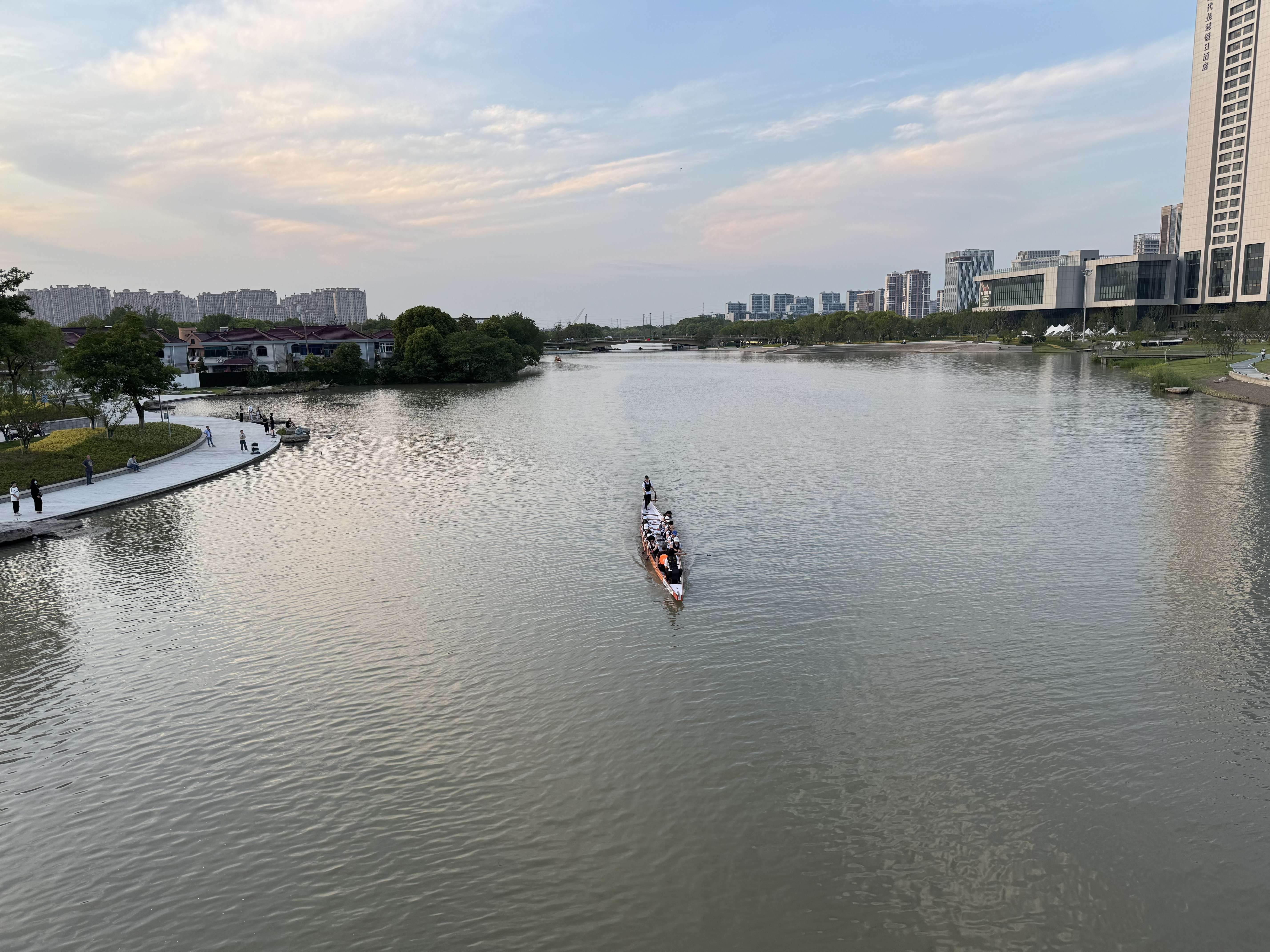 傍晚外出归来,途经桥上,意外看到几支龙舟队正在河面上紧张训练,猜想他们大概是为即将到来的端午节龙舟赛做准备吧。