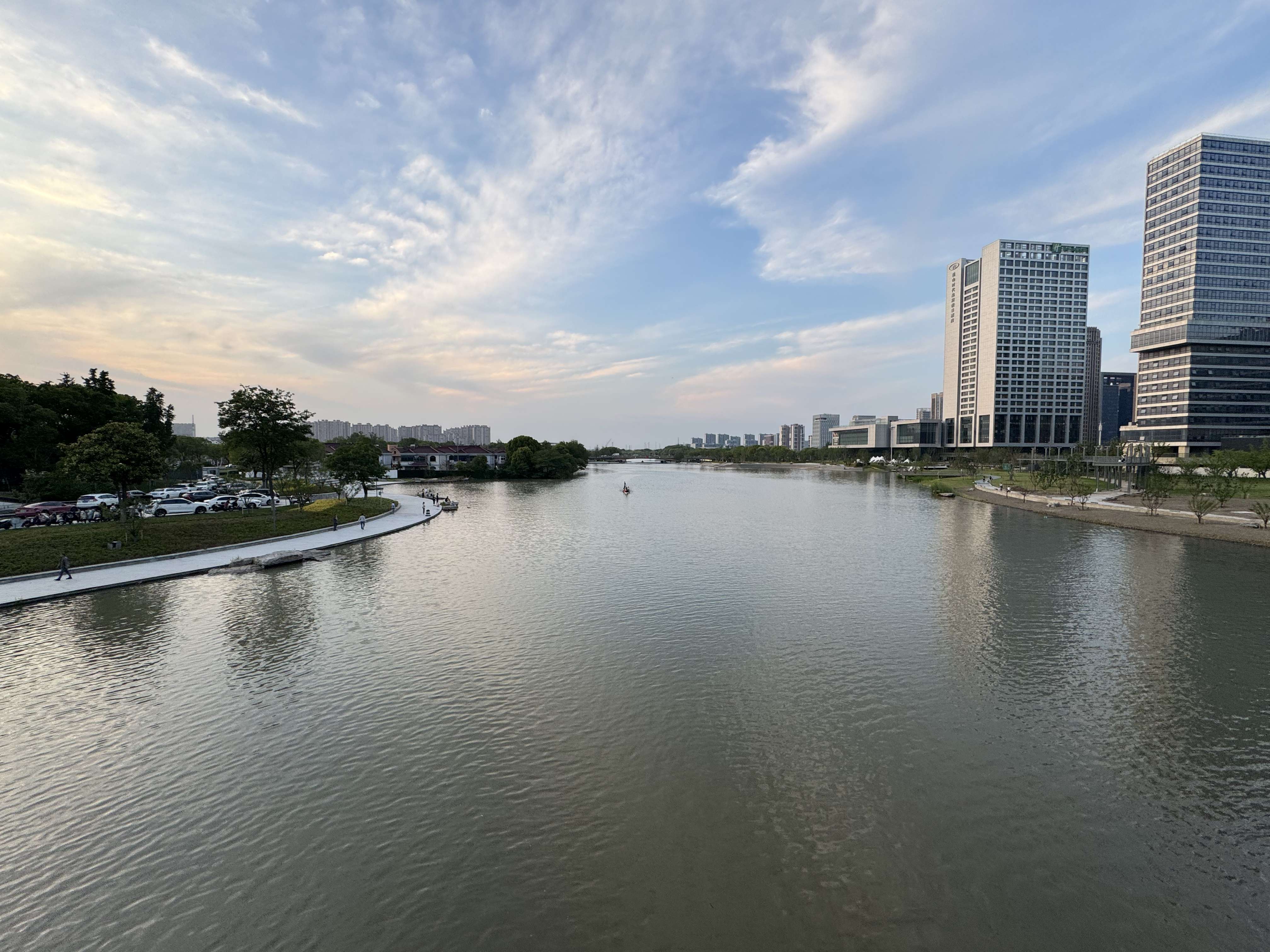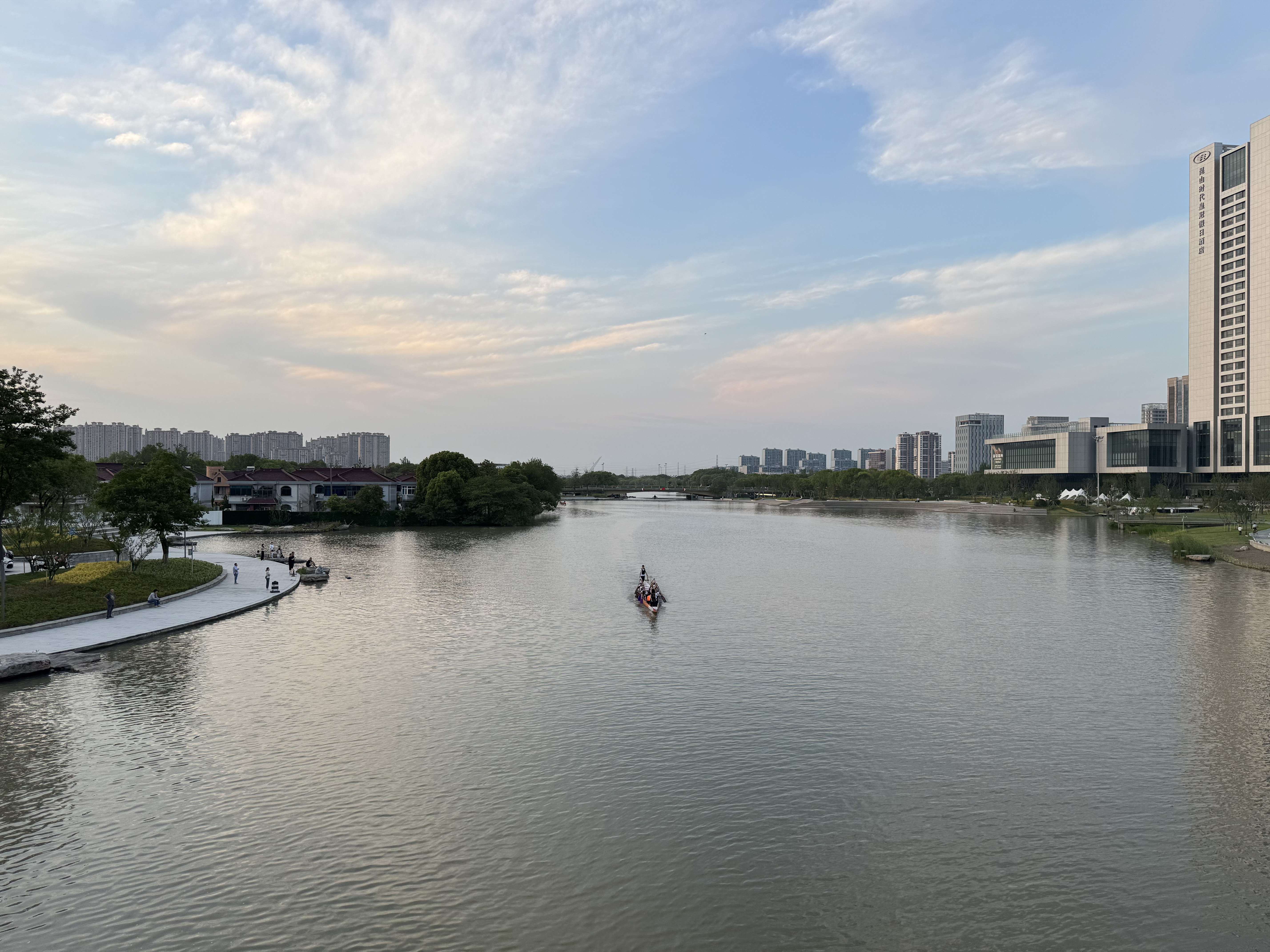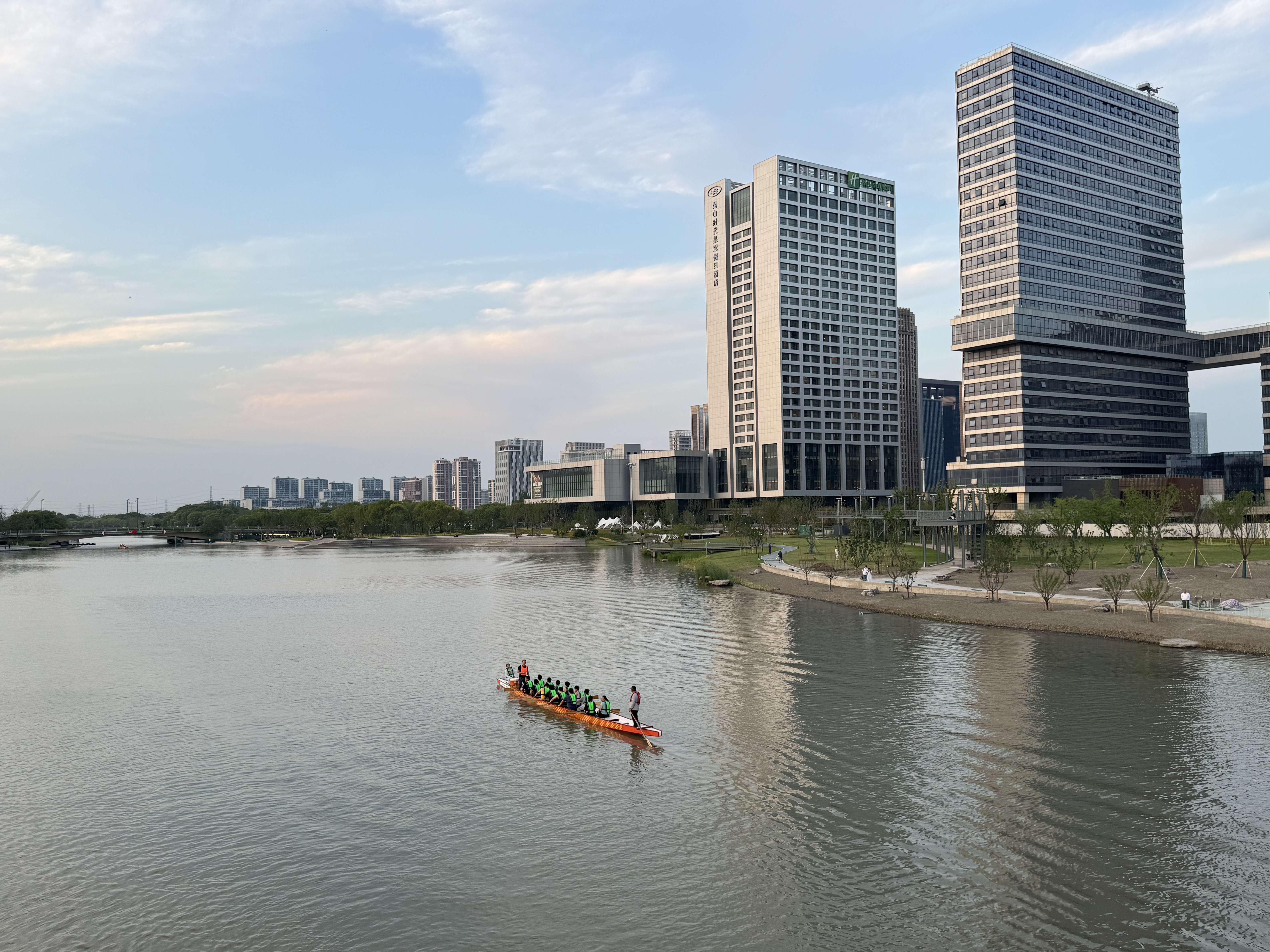 傍晚外出归来,途经桥上,意外看到几支龙舟队正在河面上紧张训练,猜想他们大概是为即将到来的端午节龙舟赛做准备吧。
